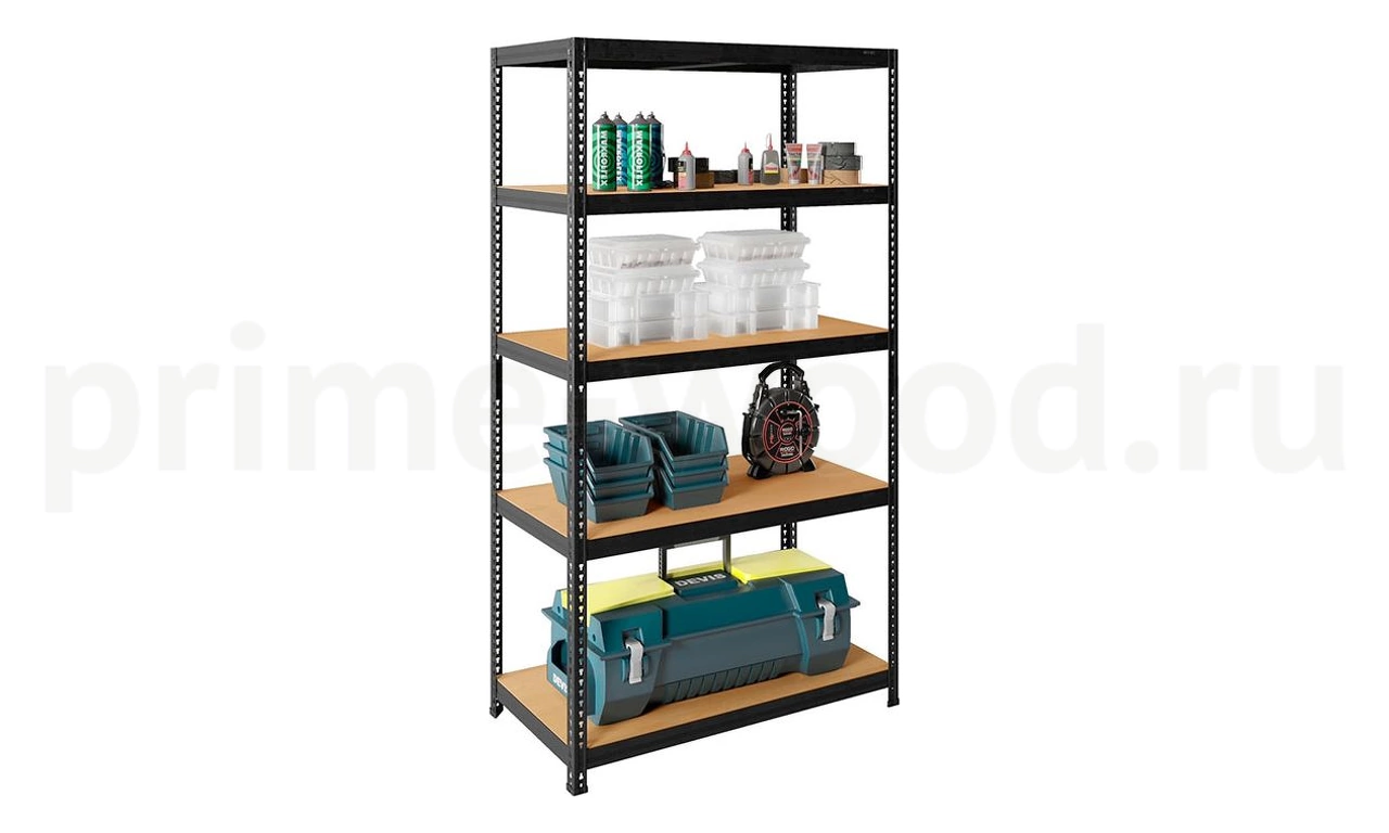 Стеллаж универсального использования в офисе, дома, гараже или на складе. Пять регулируемых по высоте ярусов.